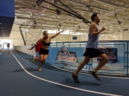 Triathlon Ontario’s races consist of a 15-minute lap swim, a 15-minute stationary bike, and a 15-minute indoor track run.